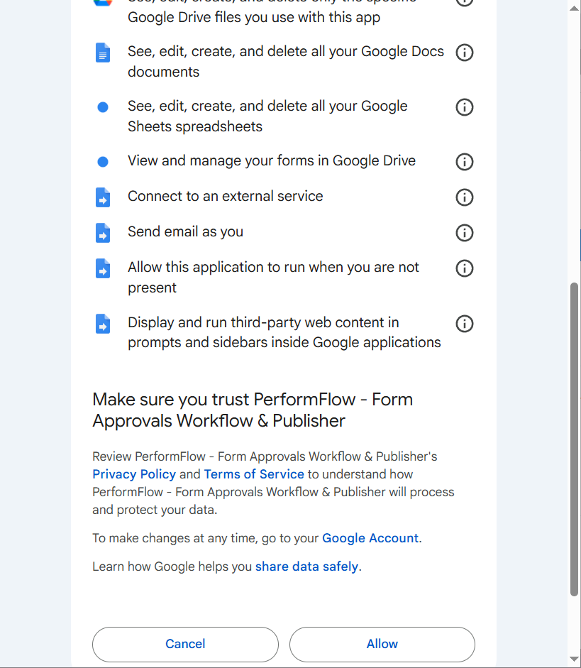 5. Allow PerformFlow – Form Approvals Workflow & Publisher to access your Google Account.